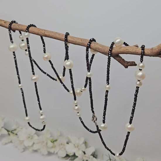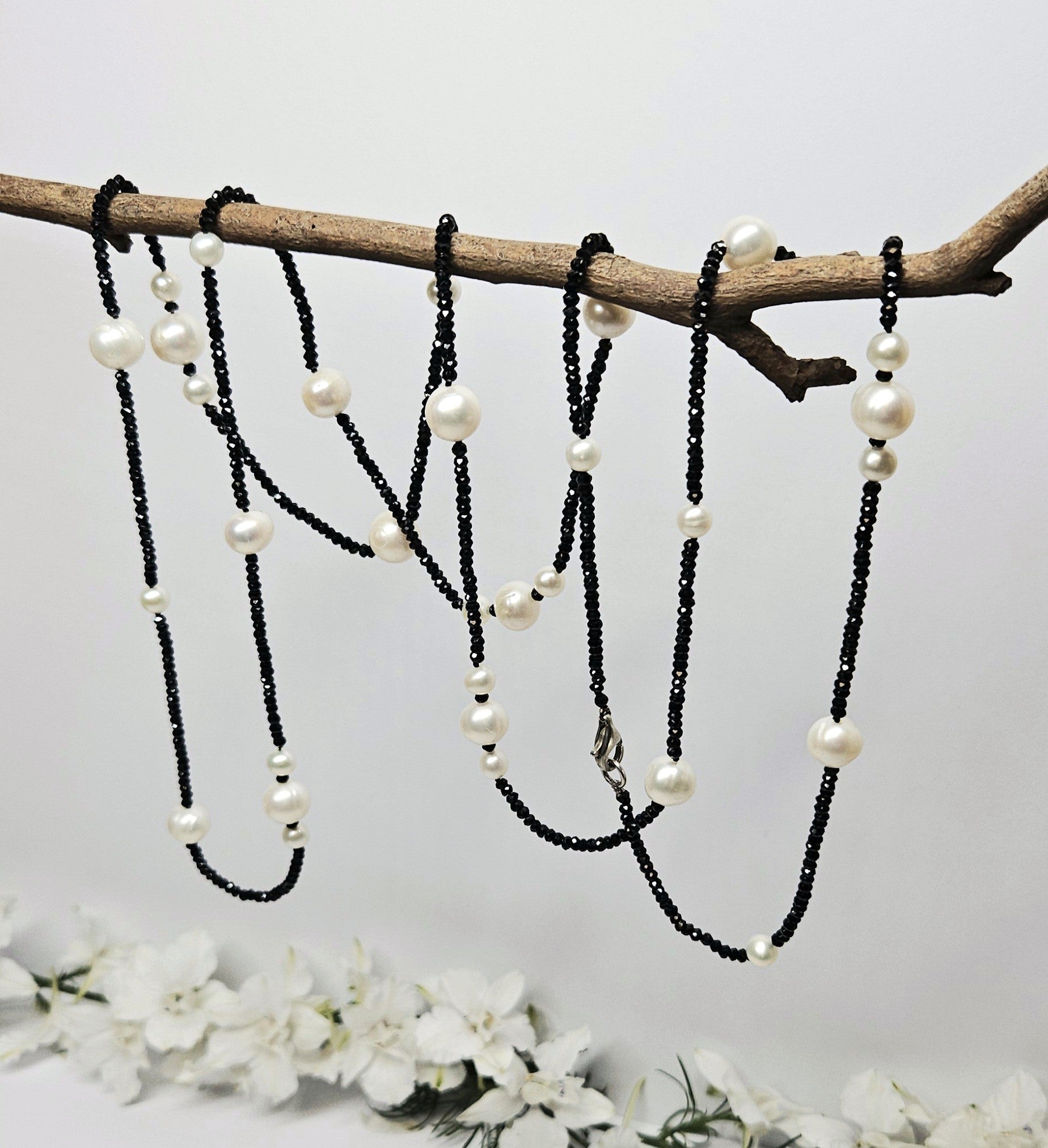 Black Spinel faceted beads, spaced throughout with Fresh water Pearls and silver catch.