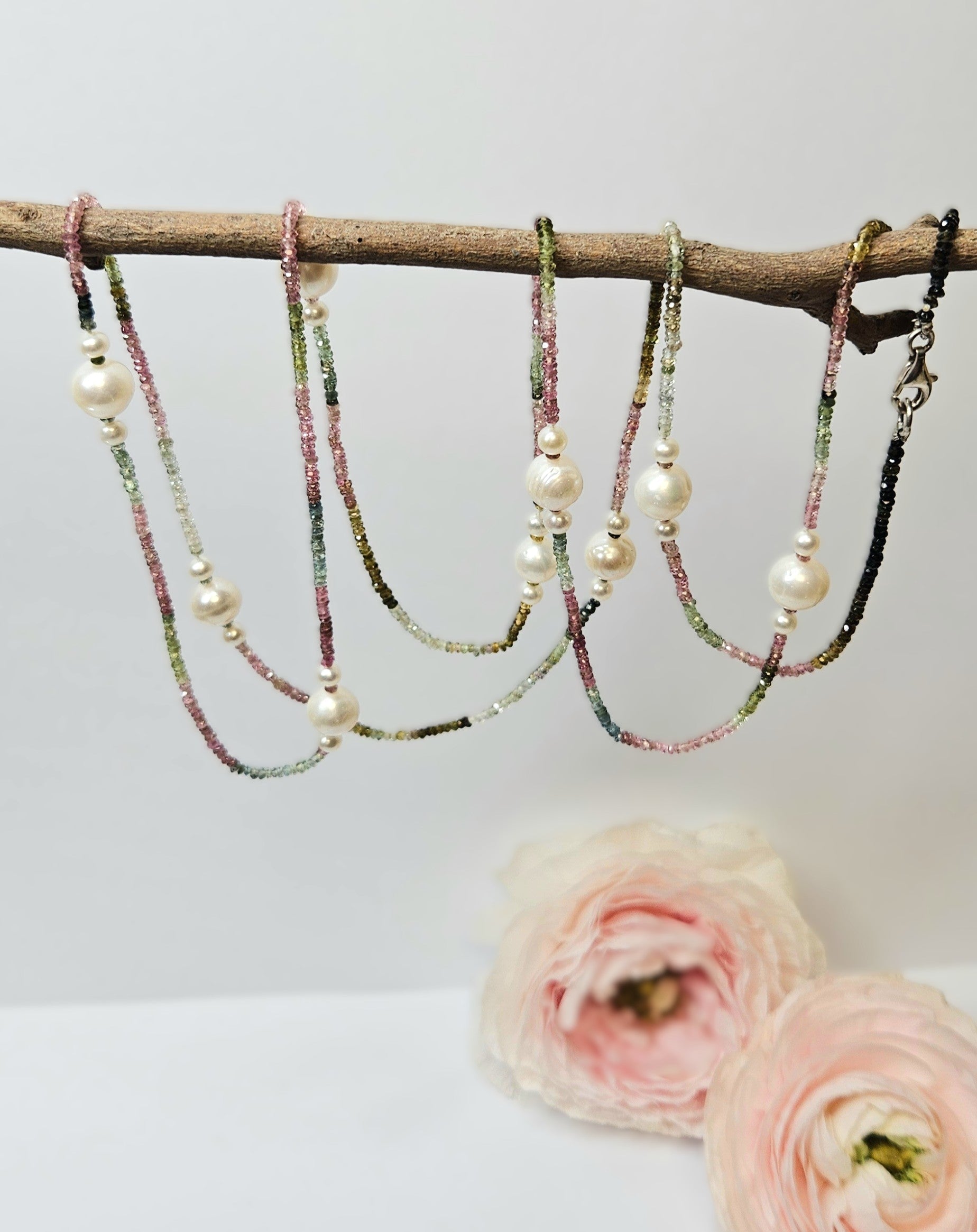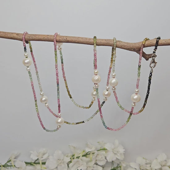 Multi-coloured faceted Tourmaline's spaced through-out with Fresh water Pearls and silver catch.